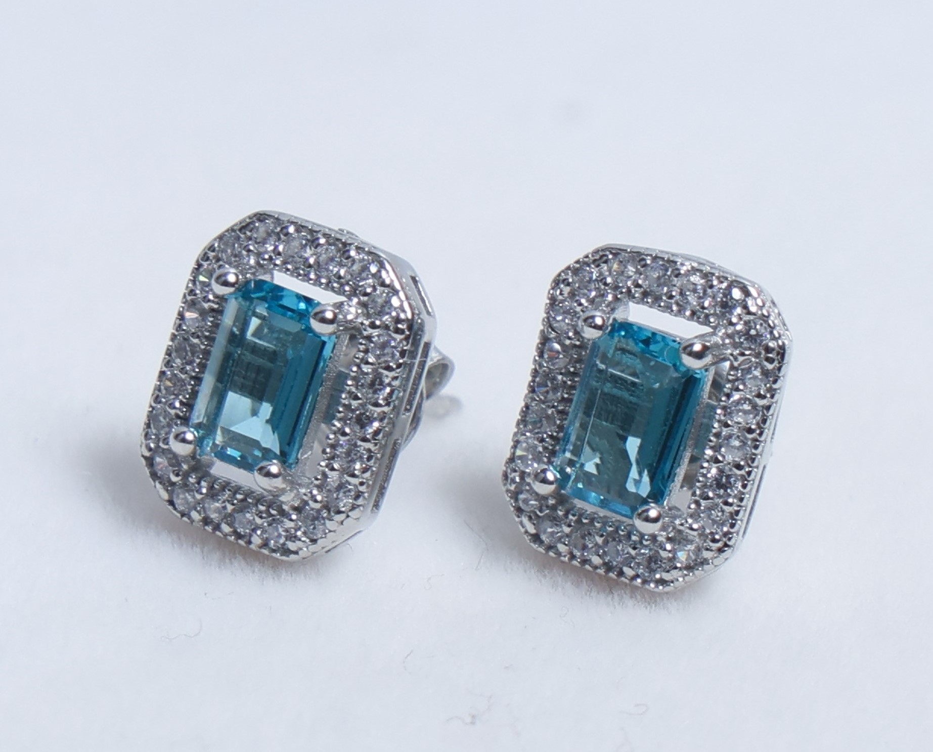 دللي نفسك مع حلق على شكل مستطيل المصنوعة من الفضة عيار 925 المطلية بالروديوم ، المزينة بأحجار الزركون اللامعة والكرستال المميز باللون الازرق السماوي.